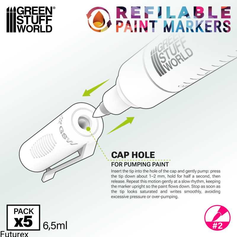 Green Stuff World refillable markers offer an innovative and practical way to apply different types of paint to your miniatures, as well as modeling, art, and craft projects. Their felt fine tips are compatible with a wide variety of products, from model paint and metallic paints, alcohol inks, chrome paints, and even oil paints, making them a versatile tool for any miniature painter, comic book artist, or even illustrator.